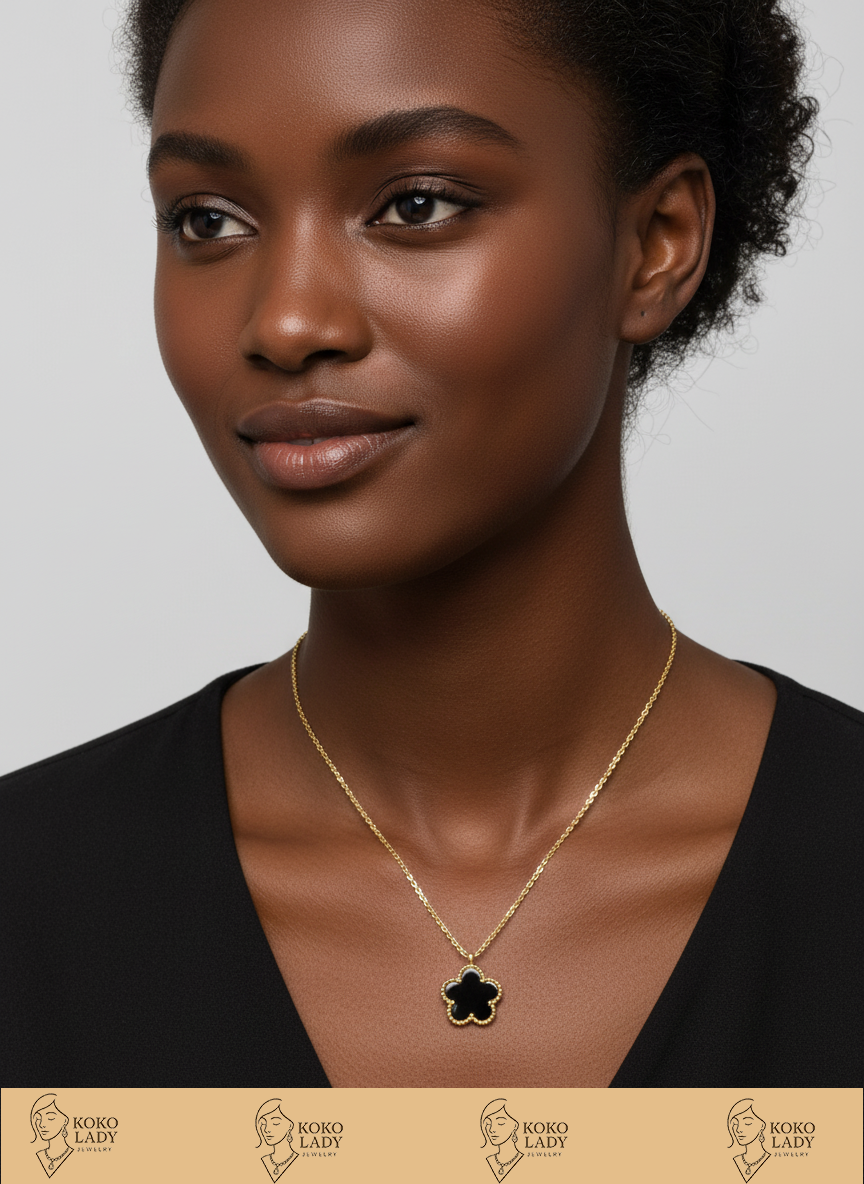 • Make a statement that is both bold and refined. The Onyx Bloom necklace features a striking black flower set in a delicate beaded gold bezel. A timeless piece that transitions seamlessly from day to night. Add this classic elegance to your collection today!