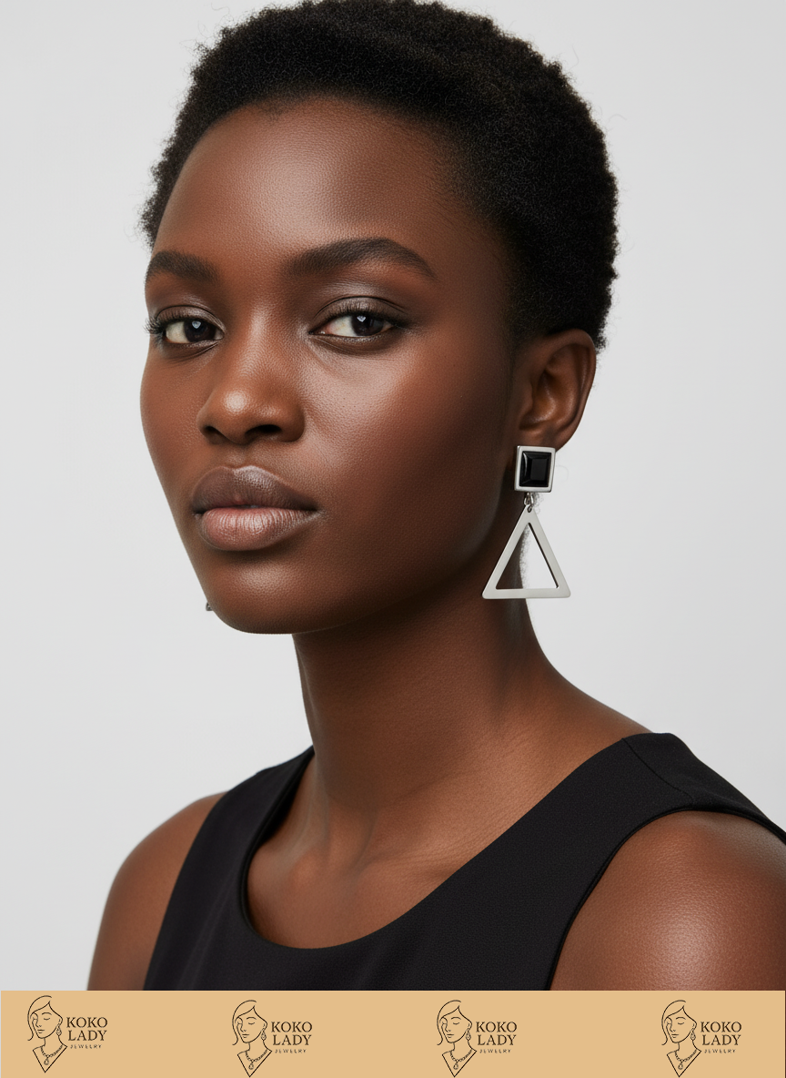 Make a statement with our ‘Geo-Drop’ Earrings, where minimalist design meets bold geometry. These stunning earrings feature a sleek, polished silver triangle base, perfectly complemented by a contrasting, deep black square stud. Lightweight and eye-catching, they are designed to add an instant touch of modern sophistication to any outfit, from casual chic to evening elegance. Elevate your style with this iconic geometric pair – a true testament to contemporary design.
