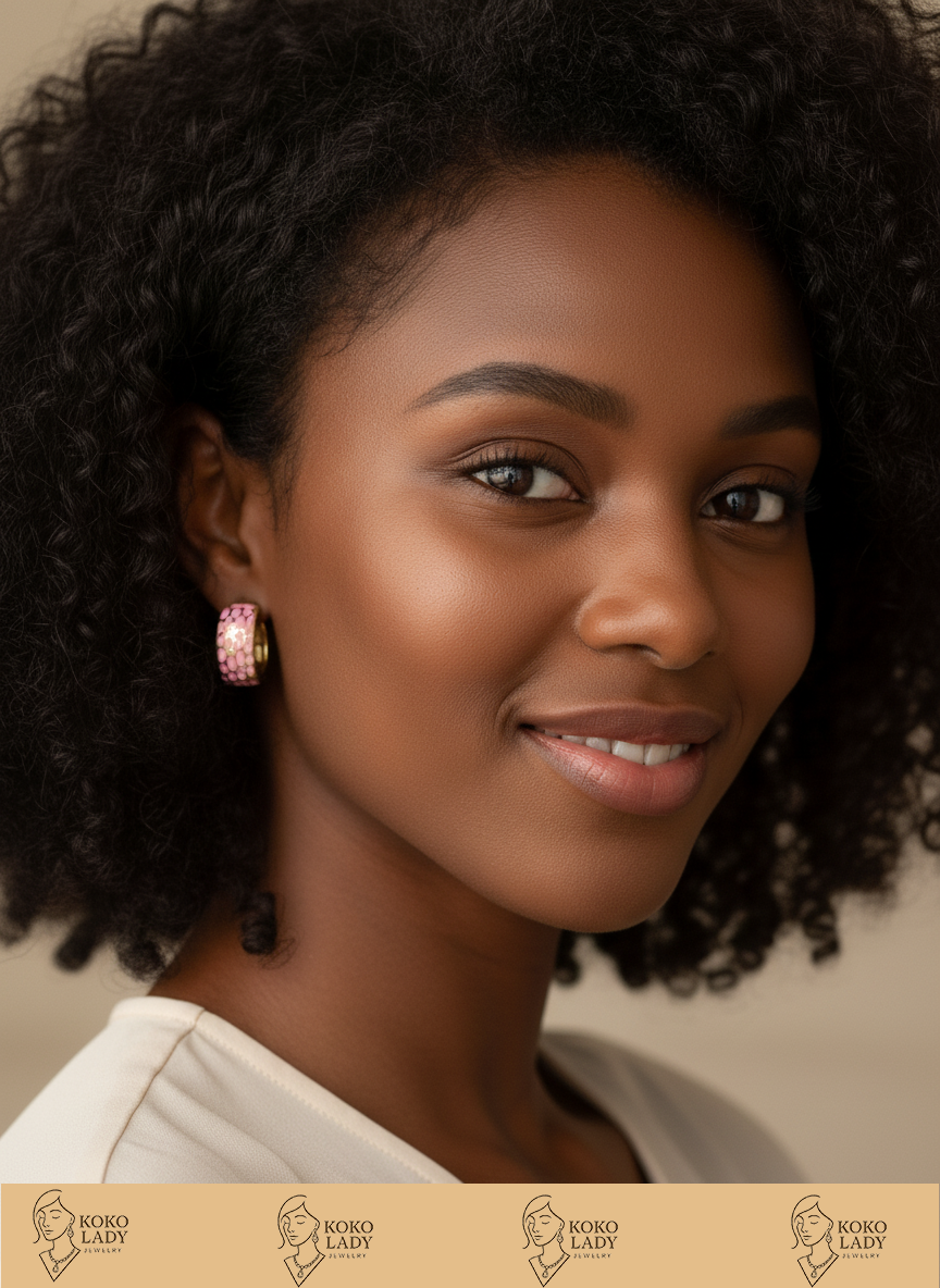 These chic earrings feature a chunky gold-toned hoop elegantly adorned with a soft pink enamel pattern, reminiscent of a subtle leopard print or delicate blossoms. The unique texture and feminine blush hue make these earrings a standout piece, perfect for adding a pop of color and personality to any outfit.