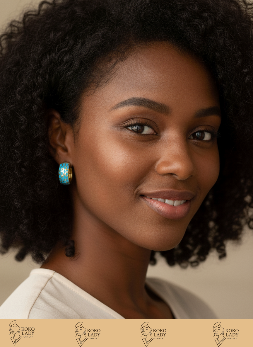 These delightful earrings combine a polished gold-toned mini hoop with an eye-catching light blue enamel pattern, hinting at a serene aquatic print or abstract artistry. The vibrant yet gentle blue hue set against the warm gold creates a striking contrast, offering a unique accent that’s both modern and effortlessly chic.