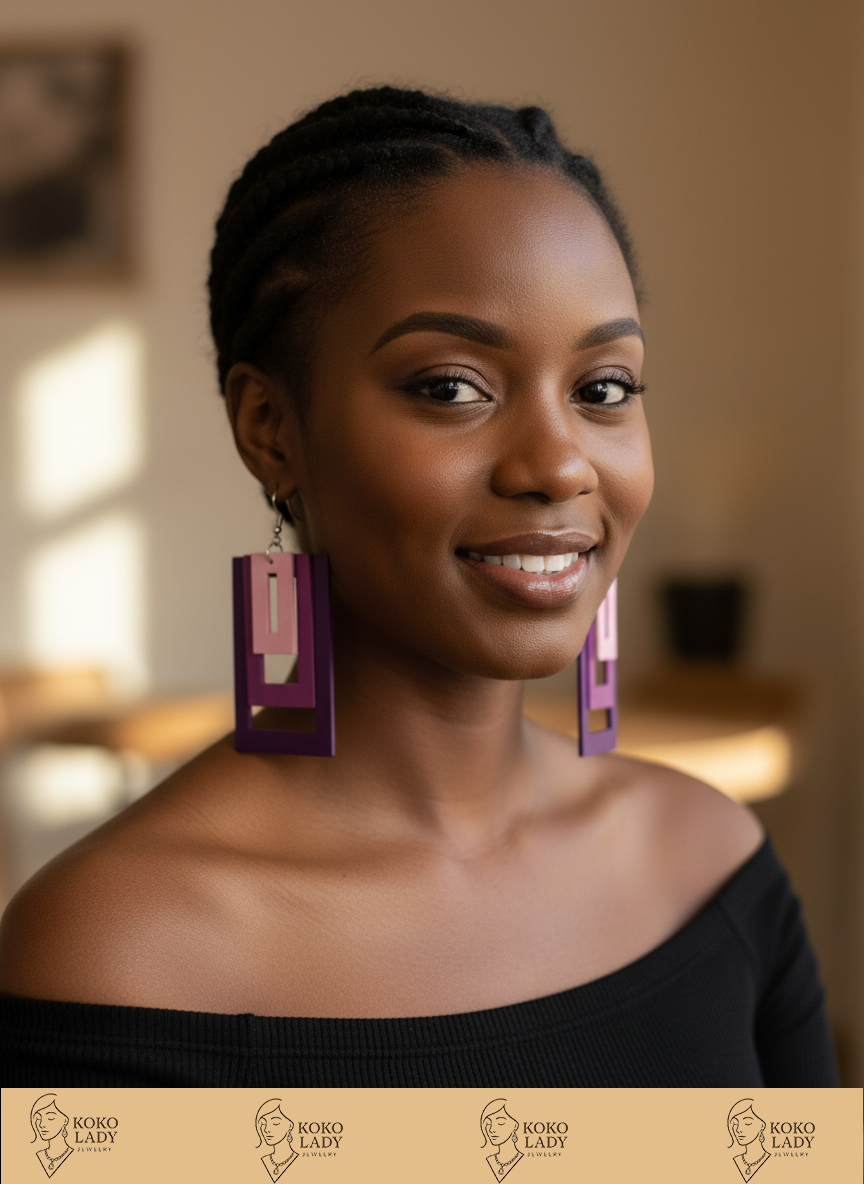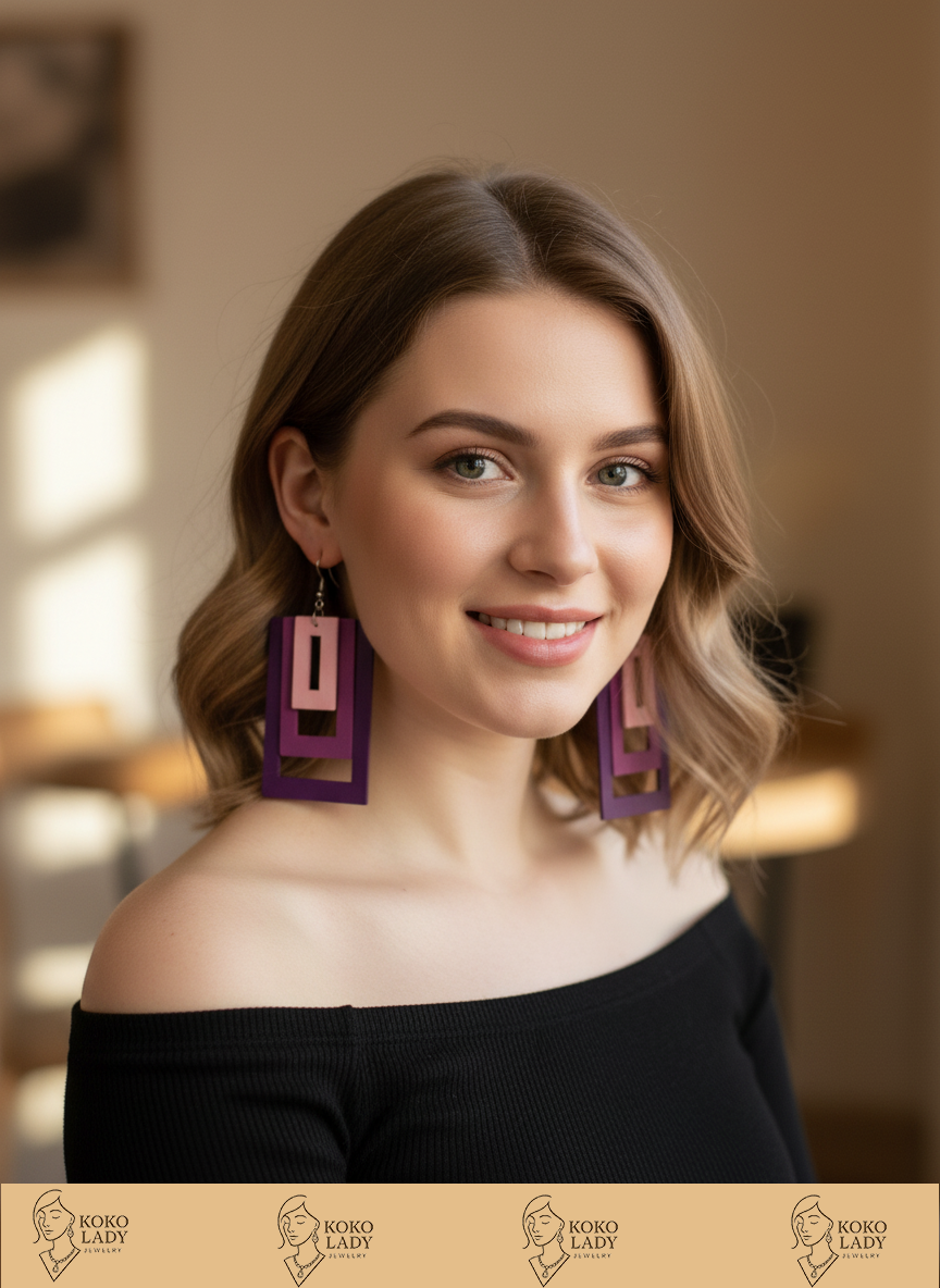 Step out in striking style with The Violet Bloom Drops! These vibrant, tiered wood earrings are the statement piece your jewelry collection has been waiting for. Featuring a chic geometric design, the alternating shades of deep violet and lovely light pink create a captivating color-block effect that’s both bold and beautiful.